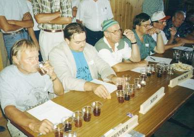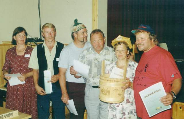 | Loppukilpailuun päässeet kuusi parasta sahtimestaria: Outi Lehto Padasjoelta (6.), Ari Saarinen Hauholta (5.), Hannu Väliviita Isojoelta (4), Veikko Rautavirta Lammilta (3.), kilpailun voittaja Raija Syrjä Hämeenkoskelta ja Tapio Hauhia Nokialta (2.). | |
