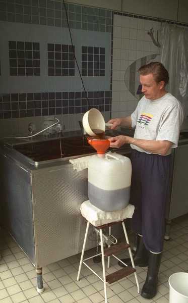 | Yleisnäkymä sisälle panimoon. | Kuvassa toimintaa pyörittävä sahtimestari Antti Vesala. Sahtivierrettä on myynnissä asiakkaan astioihin. Valmista sahtia taas myydään 1,5 litran muovipulloissa ja suuremmissa kanistereissa. |