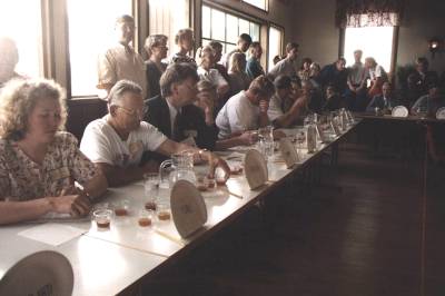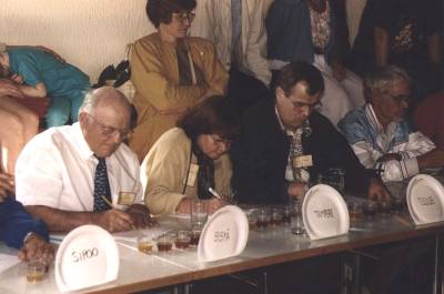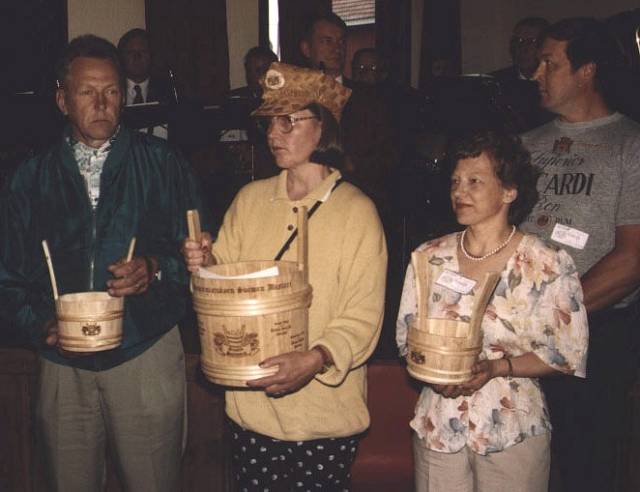| Kilpailun jälkeen sahtimestarit rentoutuivat maistelemalla toistensa sahteja.